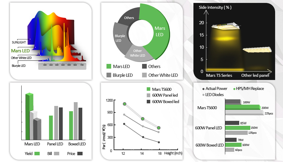 - Méně výpočtů LED grow lampy: Mars hydro TS600 má 240 LED, spotřebuje 100 W, nahrazuje starší 150 W od MH/HPS. Mars Hydro LED je energeticky účinnější a šetří energii. Až více než 20 % bočního osvětlení se neplýtvá, ale díky osazování odrazů Mars Hydro absorbuje více energie a šetří náklady na energii.